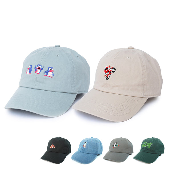 ファミコンのドットキャラをクロスステッチであしらったキャップ「KOG CAP COLLECTION」が新登場! 『ピンボール』『エキサイトバイク』『ドンキーコングJR.』『アイスクライマー』『ダックハント』『麻雀』をモチーフに、ファミコン世代の方には懐かしく、ファミコンを知らない世代の方にも普段のコーディネートに取り入れてもらえるようなアイテムを目指して作りました。
