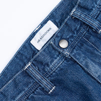 程よく色落ちしたインディゴにホワイトのステッチが特徴の『ビンテージ加工』モデル。