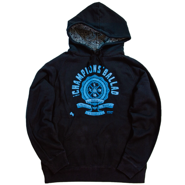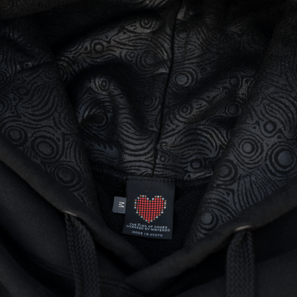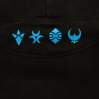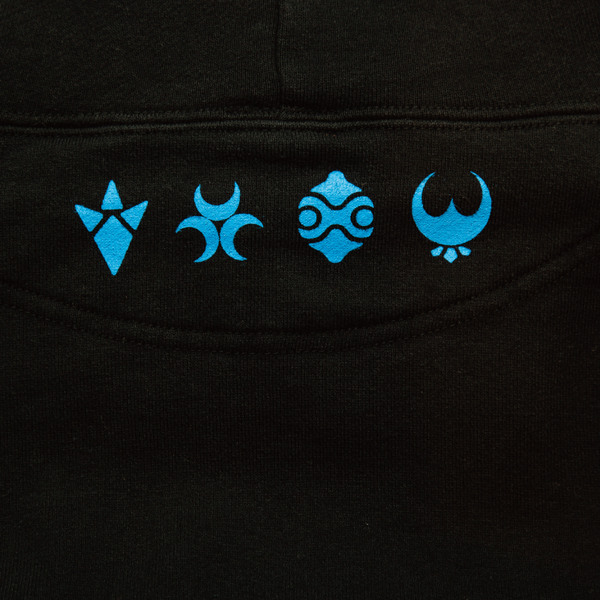 フードの内側にはゲームに登場する独特の幾何学模様をプリント。バックプリントは、各種族のマークを配置しシンプルなデザインにまとめました。