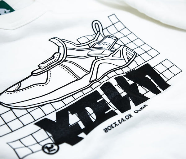 袖にはブランドロゴのプリント。裏表に付いたタグは着用時のポイントに。