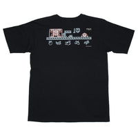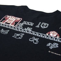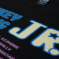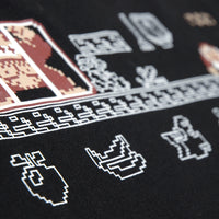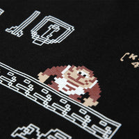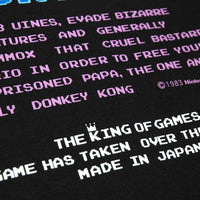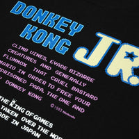 マリオが悪役を演じた、ファミコン版『ドンキーコングJr.』をモチーフにフロントはインパクトのあるタイトル画面、バックプリントにゲーム内のキャラクターなどを配置しシルクスクリーンプリントで一枚一枚、手捺染で1色に付き3回の重ね刷りで仕上げております。