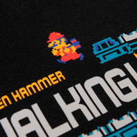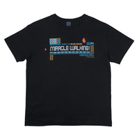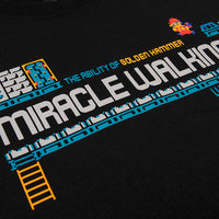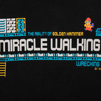 ゲーム中にある条件を満たすと登場する「ゴールデンハンマー」を取得すると敵キャラも障害物も壊す事が出来、ボタンを連打する事で「空中歩行」が出来てしまう現象を「ミラクルウォーキング」と名付けTシャツのモチーフとしました。